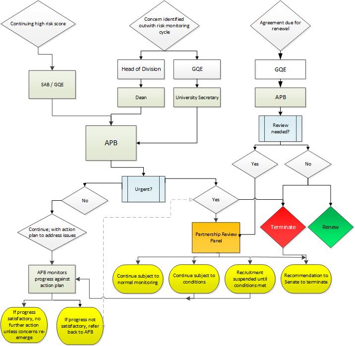 10.13 A review of the risk status of each partnership will take place before the University agrees to renew an agreement. Staff from Governance and Quality Enhancement (GQE) will: