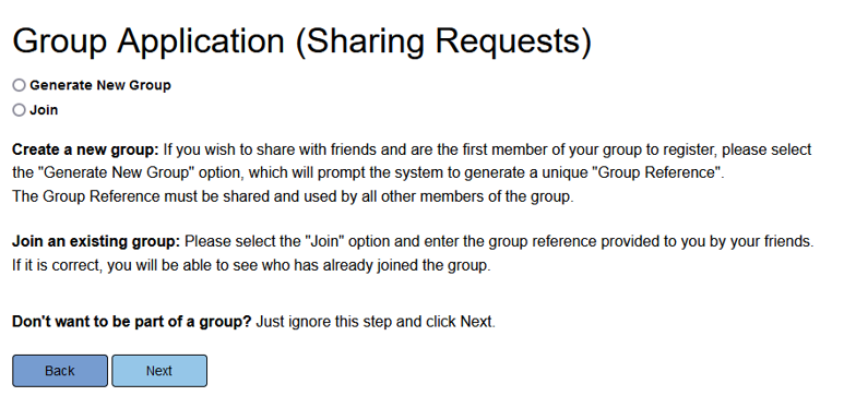 - If you wish to share with friends you must link your applications together as a group. Towards the end of your application you will have the option to either create a new group or join an existing group, as shown in the image below.