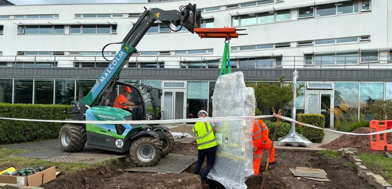 Finally, installation day arrived! We used an all-terrain forklift to move each huge panel into place - carefully guided by Bruce Laing, Director of Campus Services at QMU, who kept everything on track. Once the sculpture was bolted down, Dave got stuck into backfilling the hole and levelling out the area to make it accessible and attractive for everyone to come and visit.